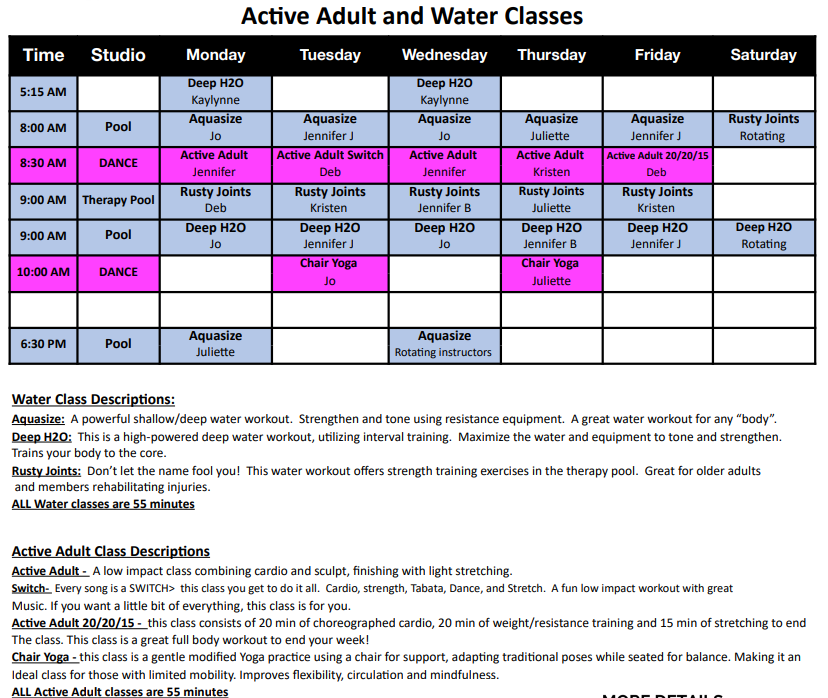 Classes are offered throughout the day to accommodate your busy schedule. All of our instructors are skilled and certified to insure you are provided with the best workout experience.